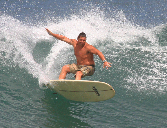 I am a firm believer in handshaped surfboards, with solid shaper surfer interaction so they can provide the best board for you, the way you surf and the waves you will most likely ride that board on. I’ve owned boards bought off the rack and I’ve had boards shaped for me. I have owned a Surftech epoxy and ridden friend’s different models. Most recently Rocky shaped two EPS boards for me. I can testify to the difference handshaped boards have made in my surfing and I’ve seen when and where the most dramatic improvements came. I’ve been surfing for 27 years, most of them I have to say I probably wasn’t very good. There has been an amazing change and it all started when I scored my first board from Rocky. Being a bigger guy 5’11” and weighing 210, having the right board makes a world of difference. Most shapers in my opinion DO NOT make proper boards for big guys, I think there are two reasons for the disconnect. First most of them aren’t big, so they can’t relate. Second I think most of them besides Ben Aipa will not go outside certain dimensional limits, that could be due to their templates or just the general thoughts of what works for the masses and anything outside that probably won’t. I think that has hurt my surfing for years. Rocky has been willing to work outside of the box to help me to get where I am and I am forever grateful. Surfing is not a sport for me it never has been it’s a huge part of my life and who I am. I have always had fun even if I wasn’t that good and the surf wasn’t either. But now being able to go out in much more challenging surf and pushing the limits of my surfing with a much more fluid style and being able to pull off much more aggressive maneuvers in critical sections is making my dreams come true and then some. As far as polyester foam boards that I have from Rocky right now. I have a 9’0”X21 1/2X3 ¾ winged pintail with two plus one set up. It is my all around boards but that pintail loves big steep surf and it has the perfect rocker to make the drops and still drive down the line. The wing gives it the added release on the turns to really feel rippable for a big thick board. I also have a 10’4”X24X3 ½” summer time south shore killer. This board has a big round nose that begs to be stood on in critical sections. He knows me so he made it with enough rocker in the nose and tail to be ridden in big surf. It’s been taken out in 6’ Hawaiian north and south shore and it makes for a very soulful but progressive ride. I have some problems with sandwich epoxy boards (Surftech and the like). I think the rails don’t work well at all. I see some people using them effectively but I don’t like the fact that they don’t really drive like handshaped rails do. I don’t like the flex pattern at all. So for me it was an 850 dollar waste of time. I was an “Epoxy Hater”. Then Rocky talked me into trying EPS, it has a stringer, it is constructed the same way the polyester boards are except the foam is epoxy and so is the glass. Rocky shaped me a progressive longboard, 9’2” X23”X2 7/8”, which is hyper thin for me. The bonuses are the EPS is super buoyant so going thinner without loosing flotation was possible, which gives me a board that is far more rippable than any I’ve owned. Also the EPS is I would say at least 1/3rd lighter than the polyester another plus. The rails are hand shaped and react like good handshaped rails react, the bottom has just enough “V” to make a difference and the flex pattern in my opinion is crisp giving the board noticeably greater drive off the turns. He also shaped me a real big guy fish. It’s 7’8”X23”X3” with 17” nose and tail. It is a quad with nice flat rocker through the center of the board and enough rocker in the nose to get me into steep waves. This board is the catalyst for a quantum leap in my surfing. Once I figured out how to get the board on it’s flat spot and do smaller rail to rail compressions it is a rocket blazing down the line. I’ve found that with the quad it still holds when I bury the rail on a steep bottom turn on juicy north shore surf and it will also break loose just enough to add that last dimensions to a roundhouse. I can launch the board off big sections no problem and now I’m starting to get air (not big as of yet) but I’m getting the board off the wave and landing it functionally adding what I am able to do in given conditions. Rocky is at the leading edge of what is possible in Longboard and Shortboard shaping. I am a prime example that an ordinary person with the right equipment can do extraordinary things. Give Rocky a shot at being a part of the evolution of your surfing, you won’t be sorry. You might be kicking yourself in the ass for not doing it sooner. More testimonials on the next page